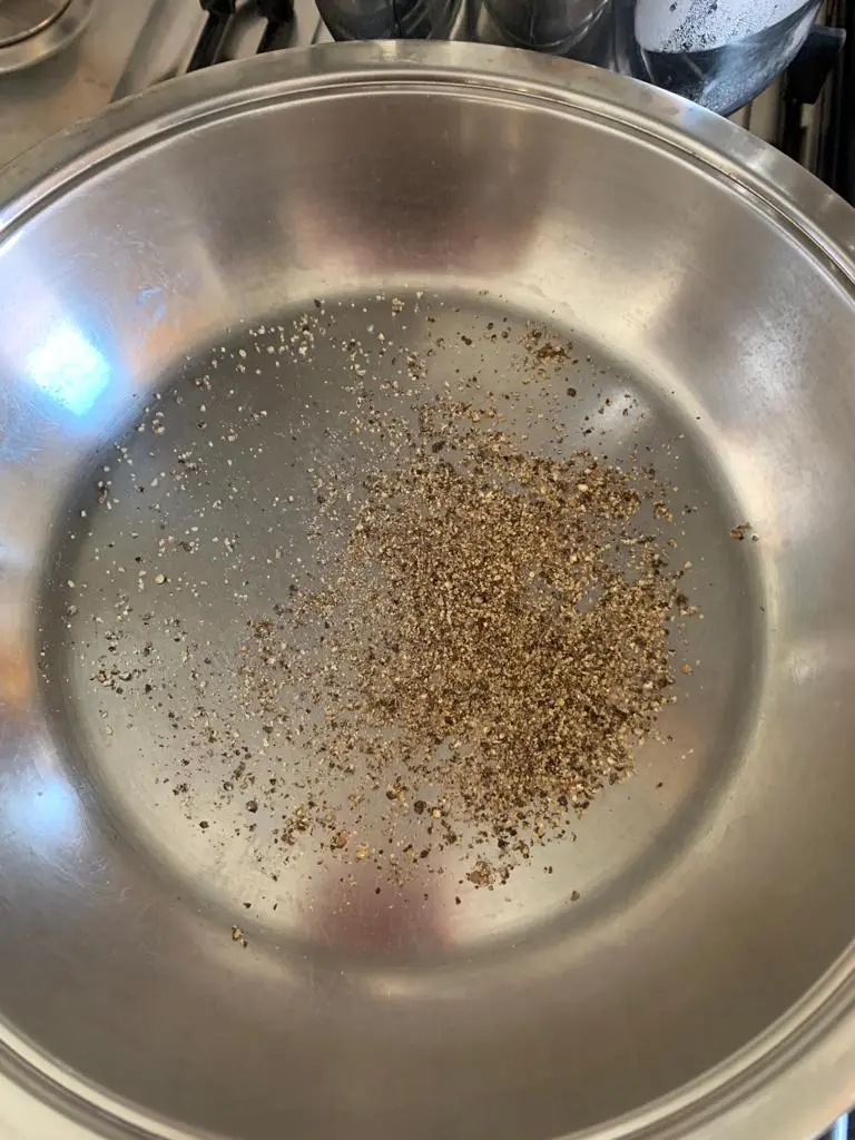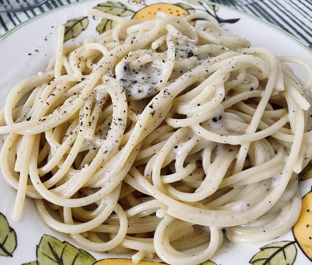 Quando l’acqua (dove ho messo meno sale del solito) bolle, butto gli spaghetti, macino i grani di pepe nero con il mortaio e li faccio tostare in una padella a fuoco basso. In una ciotola grattugio il pecorino bello stagionato e aggiungo un po’ di acqua di cottura per farne una cremina dalla consistenza della ricotta. Il pepe dopo circa tre minuti è pronto e aggiungo anche lì un mestolo di acqua.