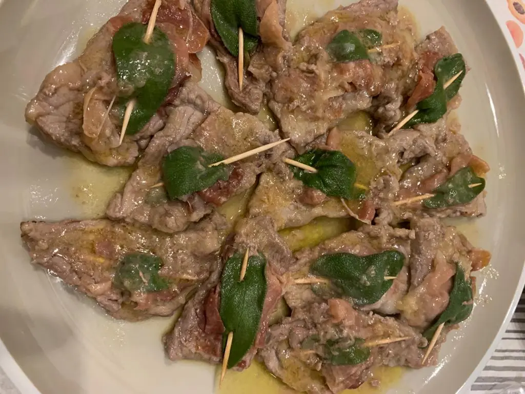Metto nei piatti e per chi la vuole ancora una bella macinata di pepe. Per i saltimbocca ho mandato il mio collaboratore domestico/tecnico del computer/marito dal nostro macellaio di fiducia Federico Quaglierini con un biglietto dove chiedevo fette di vitello sui 4 mm di spessore. Si sono fatti grandi risate sul fatto che nel negozio mancava un calibro per misurarle. Sono pignola, ma se fossero state un millimetro in più o meno non sarebbe stata certo la fine del mondo! Sulla carne metto il prosciutto e la salvia, fissando tutto con uno stuzzicadenti ed infarino la parte di sotto. In una padella, da toscana, aggiungo solo olio d’oliva e non il burro come la ricetta chiederebbe e quando è caldo metto i saltimbocca.