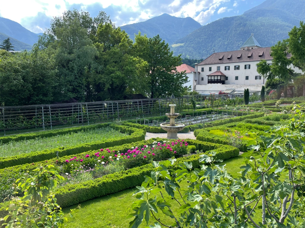 Già all’arrivo al paesino di Varna ci accoglie un bellissimo paesaggio di frutteti, prati verdi e profumati e vigneti terrazzati con muri a secco. Entrando nell’Abbazia incastonata tra le montagne mi sono sentita all’improvviso catapultata in un tempo lontano, in un luogo che invita a vivere ad un ritmo più lento e rilassato. Un giardino da fiaba, una biblioteca antica, una basilica gotica. Eravamo improvvisamente finiti dentro “Il nome della Rosa” e mi aspettavo da un momento all’altro di veder comparire Guglielmo di Baskerville. A proposito, all’interno delle mura c’è un bellissimo giardino barocco dove ho scoperto crescono oltre settanta varietà di piante officinali, come l’erba cardiaca o la trigonella, la citronella, la salvia di melone, il timo giamaicano ed il tabacco, dalle quali si producono ottime tisane ed inoltre vi sono tantissimi tipi di rose. Queste erbe e piante regalano ai vini dell’Abbazia un meraviglioso bouquet di sentori. Perché questo luogo, oltre ad essere il più grande complesso conventuale del Tirolo, …è tra le cantine attive più antiche del mondo vinificando da oltre 850 anni. Le vigne vengono coltivate senza uso di diserbanti chimici e con trattamenti minimamente invasivi.