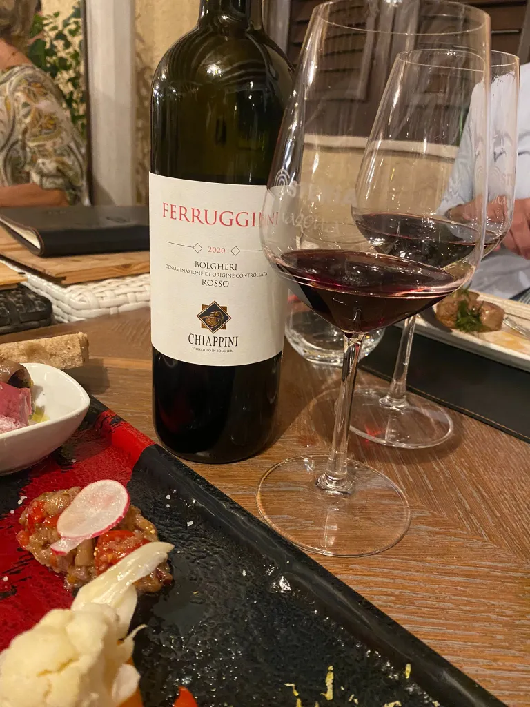 Con queste delizie abbino volentieri un ottimo vino prodotto a poche centinaia di metri: “Le Ferruggini” della Famiglia Chiappini, che iniziò a coltivare queste terre negli anni Cinquanta quando Giovanni emigrò dalle Marche in Toscana. Si tratta di un rosso assemblato con Sangiovese, Cabernet Sauvignon e Syrah di un bel colore rosso rubino intenso che ben si armonizza con quello della carne ed aromi di frutta rossa matura, rosa, viola e pepe nero. Se fossi all’esame finale per Sommelier parlerei anche di mineralità, ma tale sentore si trova per me in una nebulosa che non ho ancora esplorato. Il sapore è piacevolmente fruttato, morbido, tannico. In definitiva per i parametri comuni e per i miei in particolare… è buono.