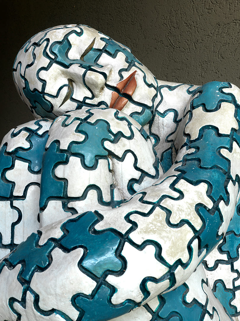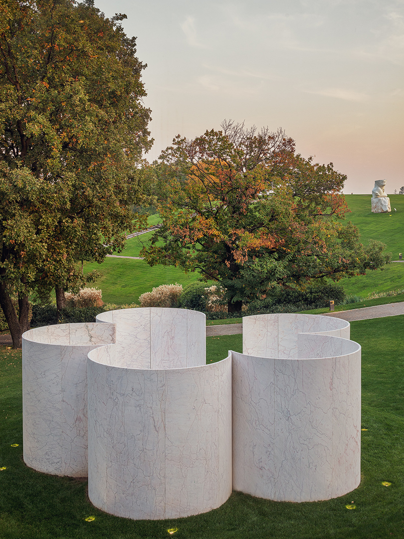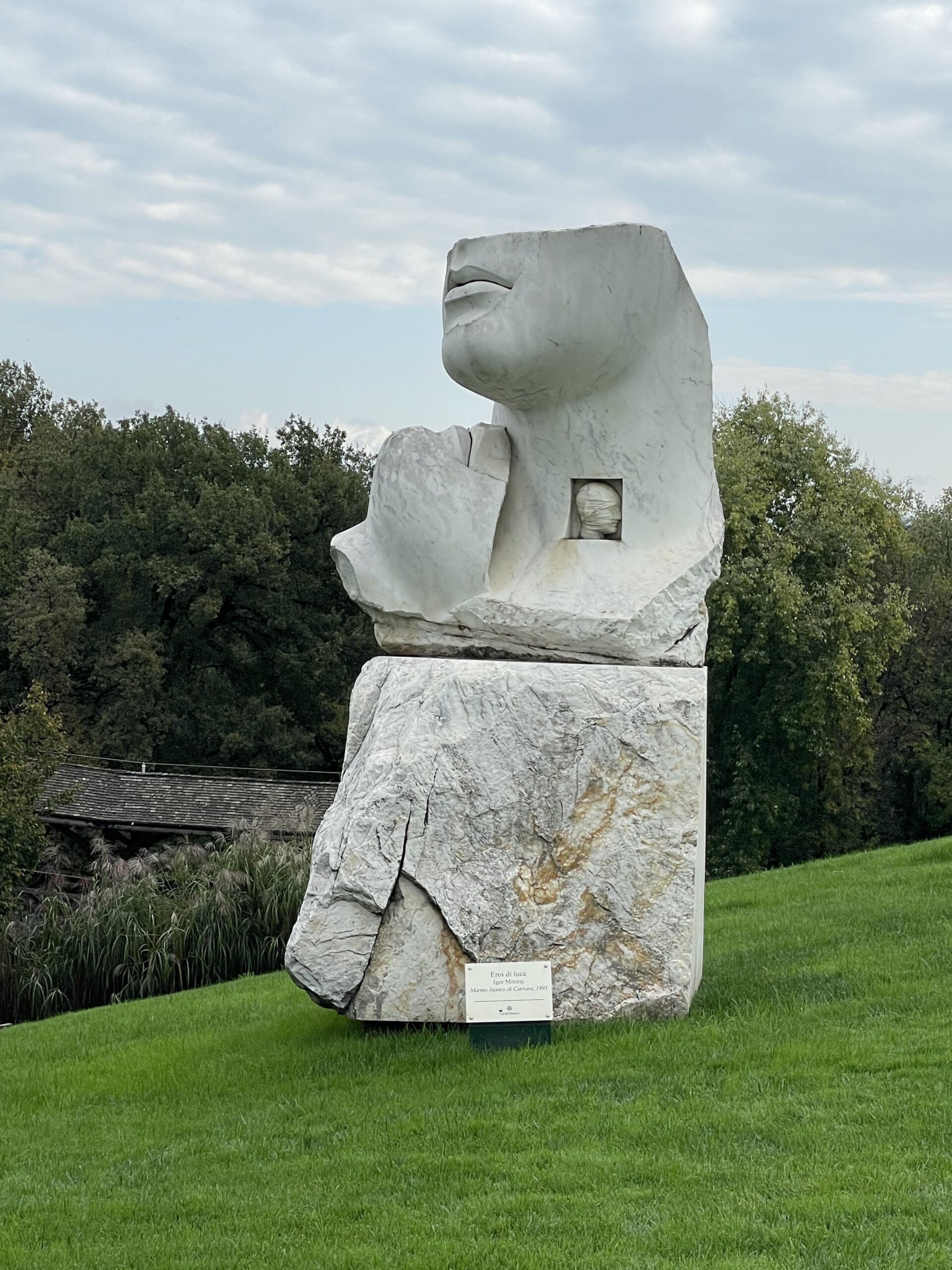 La prima è il bellissimo Cancello del Sole, di Arnaldo Pomodoro, posto all’ingresso della tenuta, che ci ha letteralmente lasciati a bocca aperta… quando si è aperto ci è sembrato di essere entrati in un luogo diverso, scandito dai tempi della natura e delle sue stagioni. Ma le sorprese si sono susseguite con gli “Eroi di Luce” una scultura in marmo di Igor Mitoraj, una testa recisa dal sogno con l’inserto di una testa velata, che in quel contesto è proprio un frammento luminoso rispetto al verde che la circonda. A seguire “Elogio dell’Ombra” di Bruno Romeda, una struttura leggera inserita nel contesto del laghetto della tenuta e “Codice Genetico” di Rabarama, una figura raccolta in posizione fetale con la pelle a scaglie raffigurata come un puzzle di codici e linguaggi nascosti.