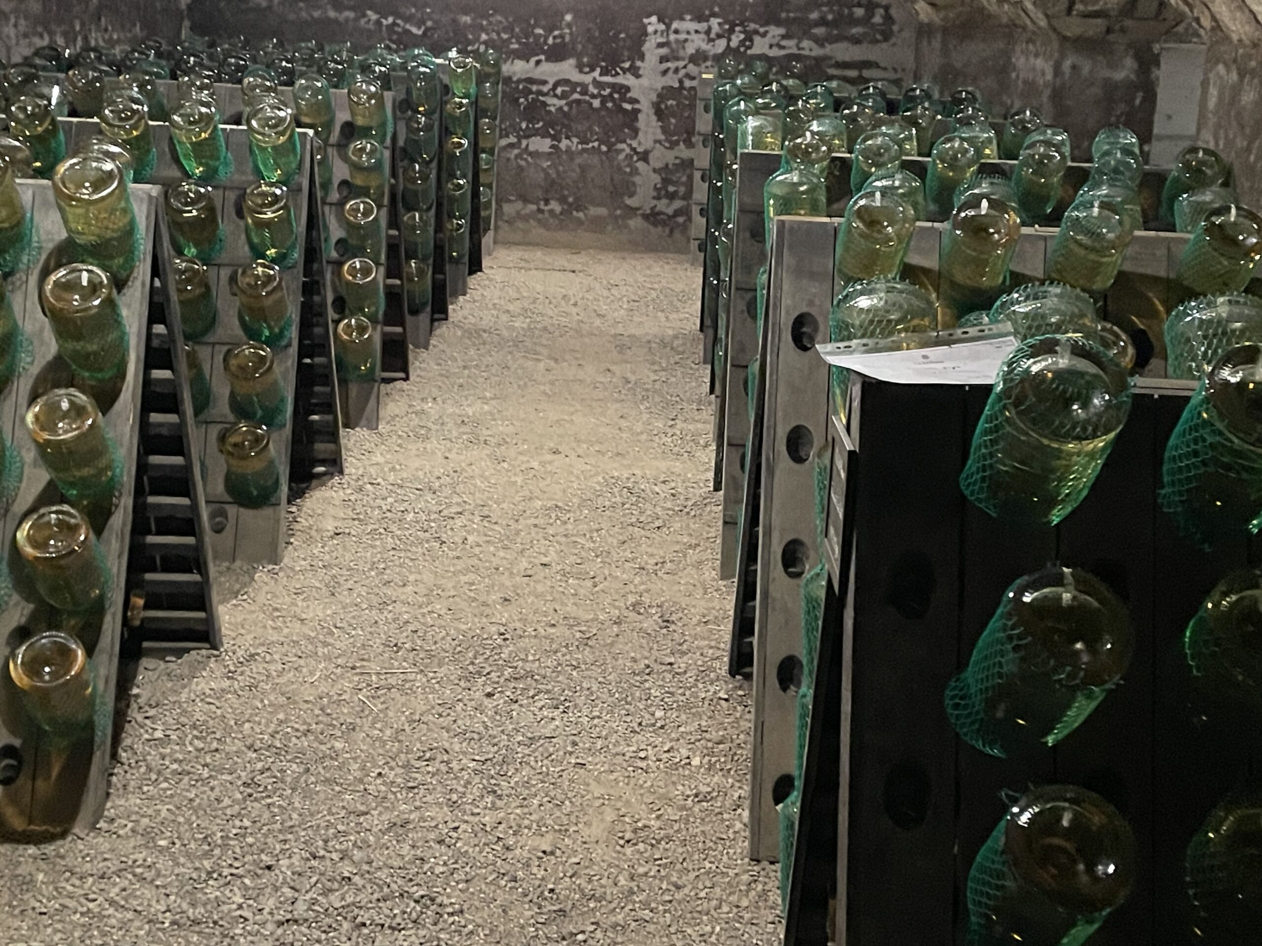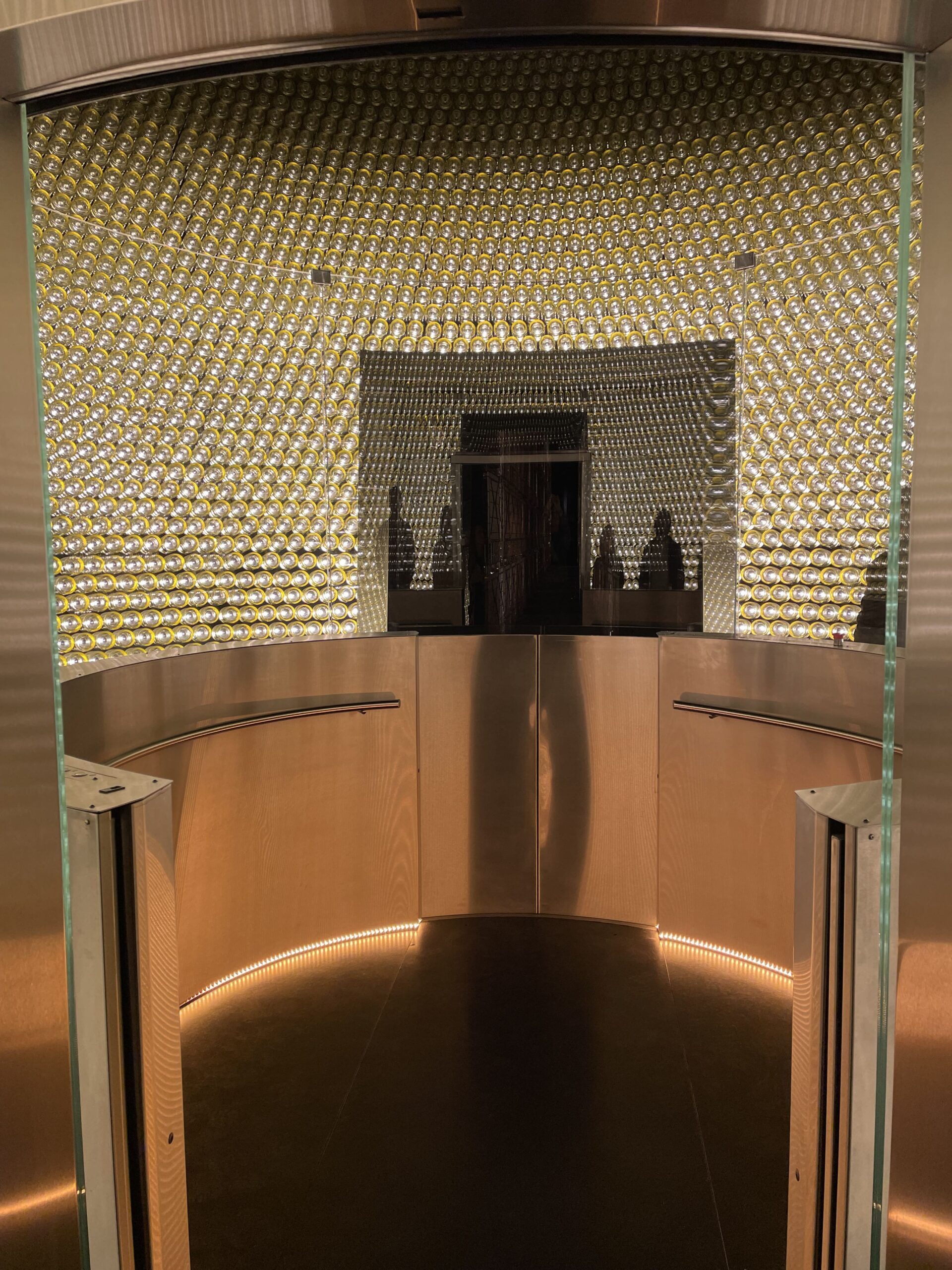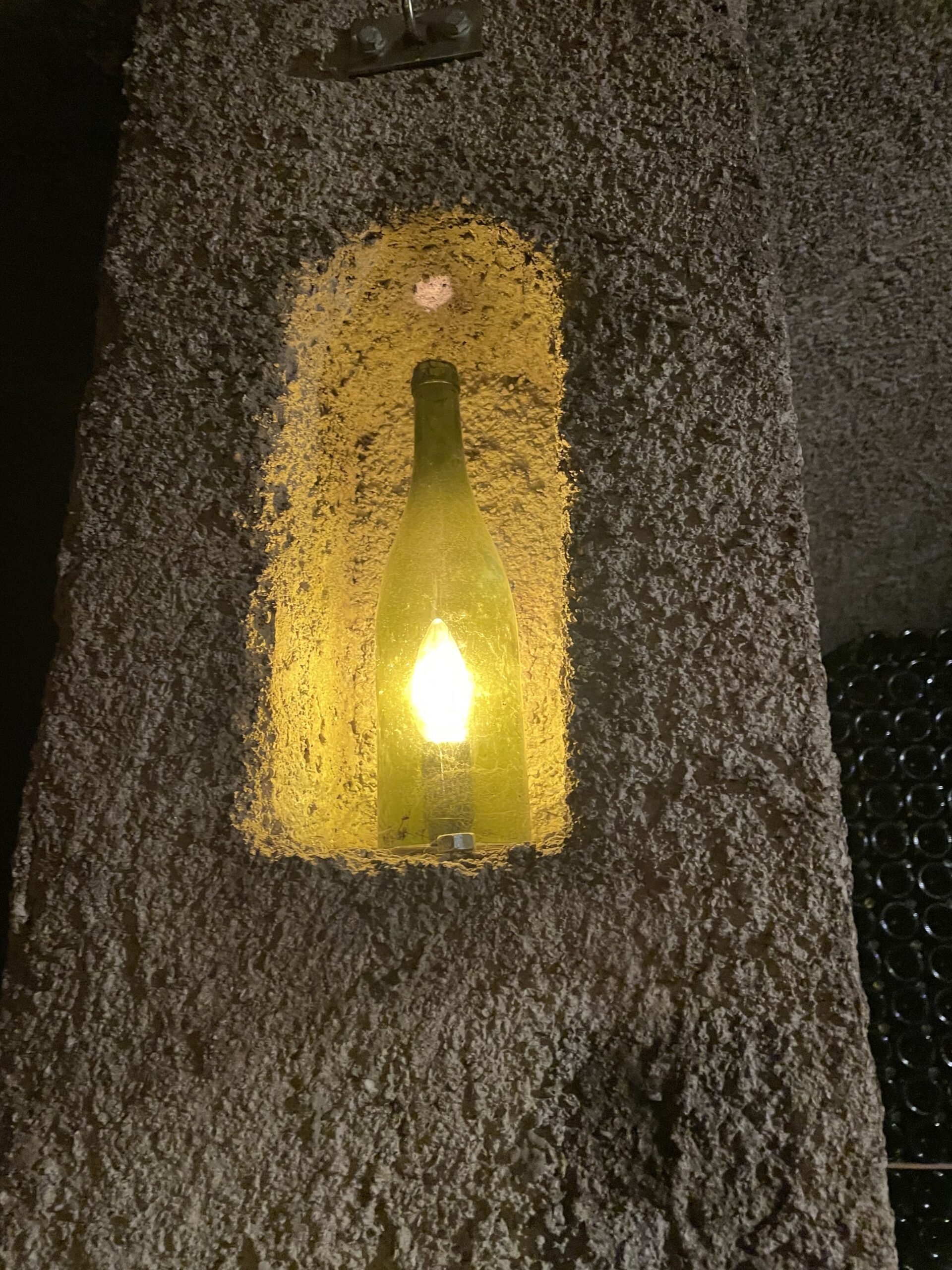 Che dire della cantina e dei tesori che contiene. Al di là della cura nelle varie fasi della vendemmia, due cose in particolare mi hanno colpita: il sistema di lavaggio ed asciugatura delle uve attivo dalla vendemmia 2008 per eliminare dal grappolo microrganismi indesiderati, polveri sottili e residui dei trattamenti agricoli; un’attenzione non solo alla qualità ma anche alla salute. Una sorta di “terme degli acini”. Inoltre, la speciale macchina tappatrice, elimina l’ossigeno prima della chiusura, riducendo ulteriormente la presenza di solfiti, e permettendo un ridotto utilizzo di anidride solforosa. Ma le sorprese non finiscono qui… il viaggio in cantina continua in una specie di caveau dorato fatto di bottiglie, nel quale ci si immerge perdendo quasi l’orientamento ed avendo l’impressione di essere un lievito che lentamente scende nella bottiglia. L’assistente ha commentato definendola una location da film di James Bond!
