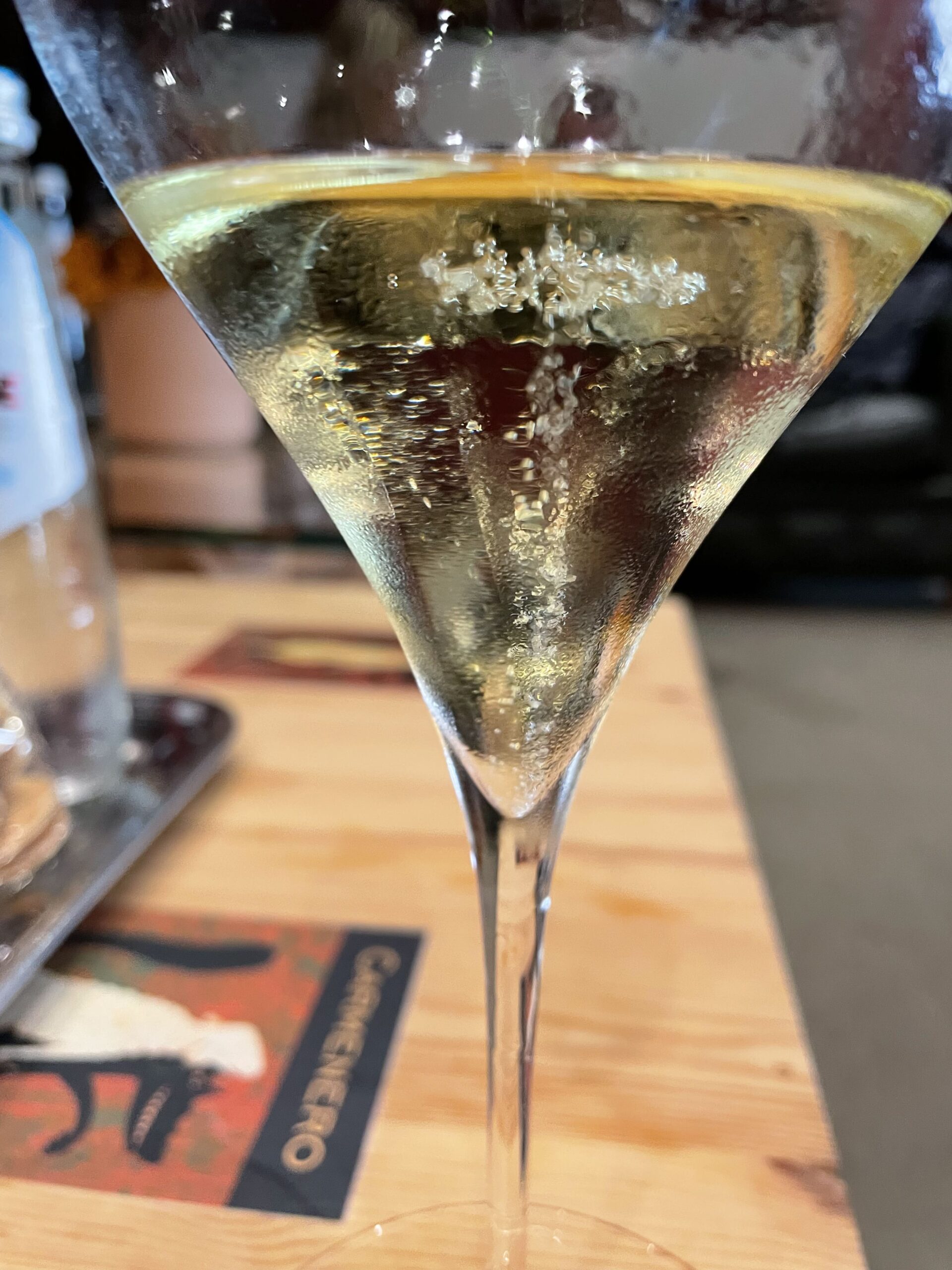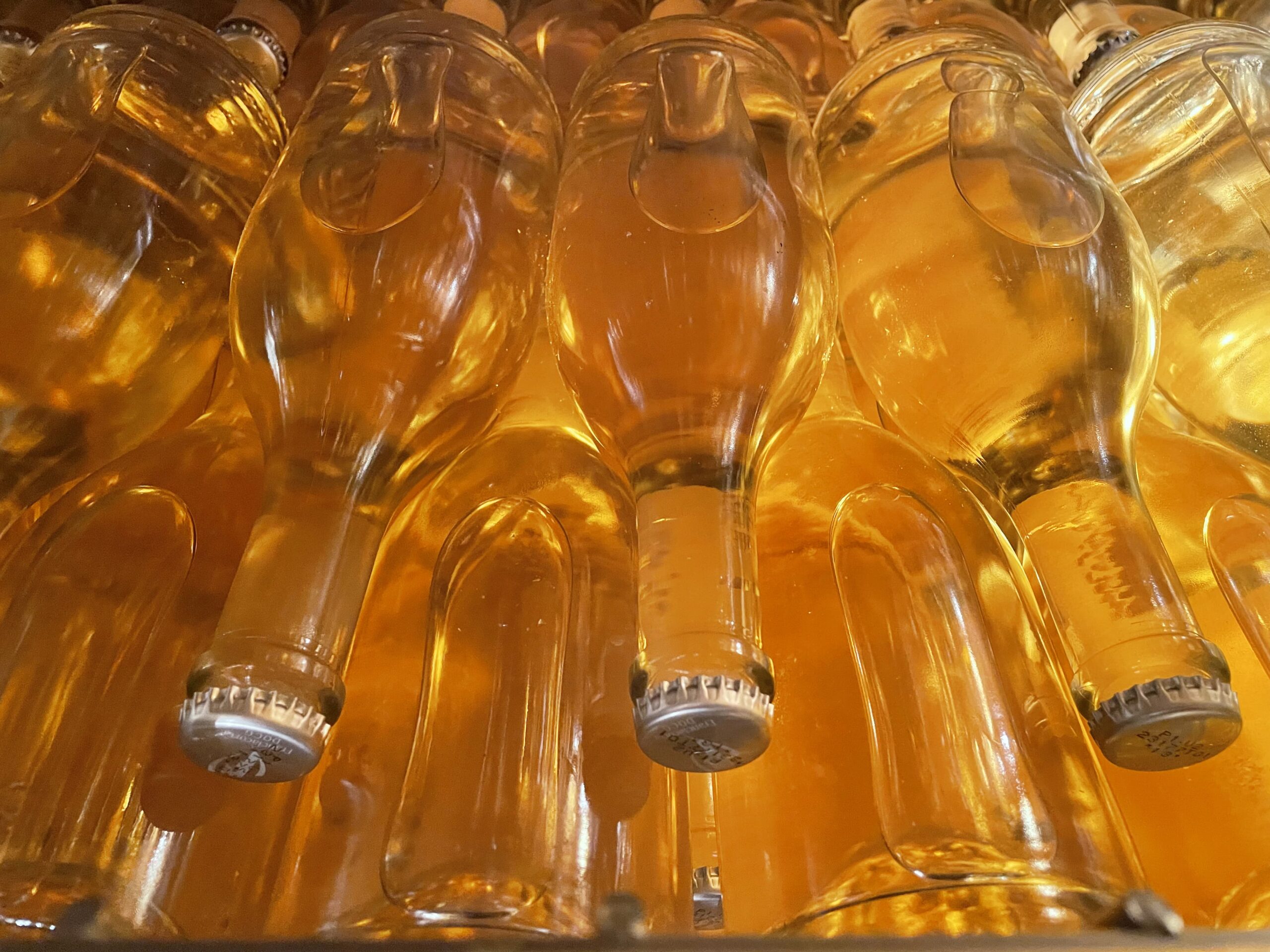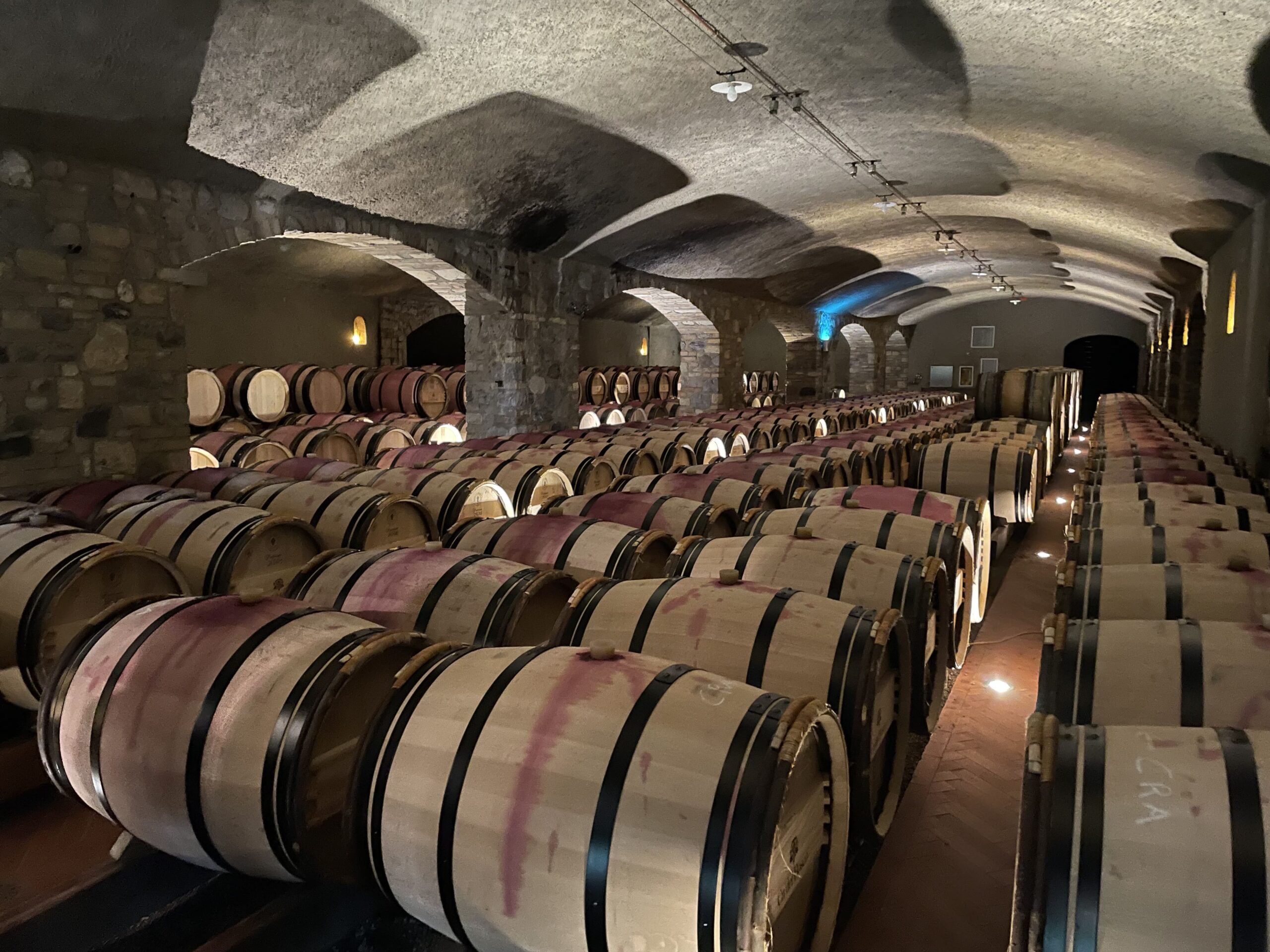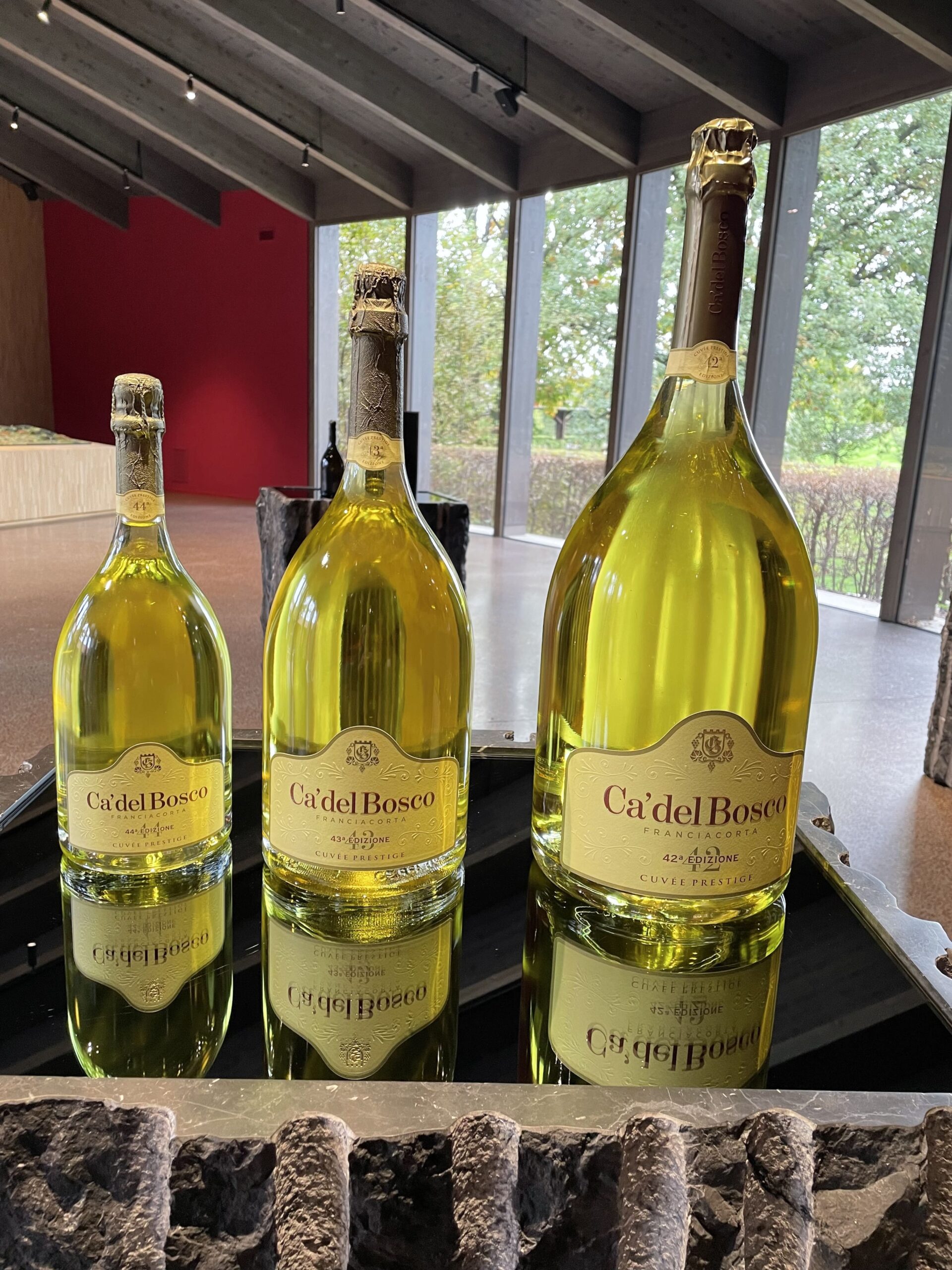 Che dire della cantina e dei tesori che contiene. Al di là della cura nelle varie fasi della vendemmia, due cose in particolare mi hanno colpita: il sistema di lavaggio ed asciugatura delle uve attivo dalla vendemmia 2008 per eliminare dal grappolo microrganismi indesiderati, polveri sottili e residui dei trattamenti agricoli; un’attenzione non solo alla qualità ma anche alla salute. Una sorta di “terme degli acini”. Inoltre, la speciale macchina tappatrice, elimina l’ossigeno prima della chiusura, riducendo ulteriormente la presenza di solfiti, e permettendo un ridotto utilizzo di anidride solforosa. Ma le sorprese non finiscono qui… il viaggio in cantina continua in una specie di caveau dorato fatto di bottiglie, nel quale ci si immerge perdendo quasi l’orientamento ed avendo l’impressione di essere un lievito che lentamente scende nella bottiglia. L’assistente ha commentato definendola una location da film di James Bond!