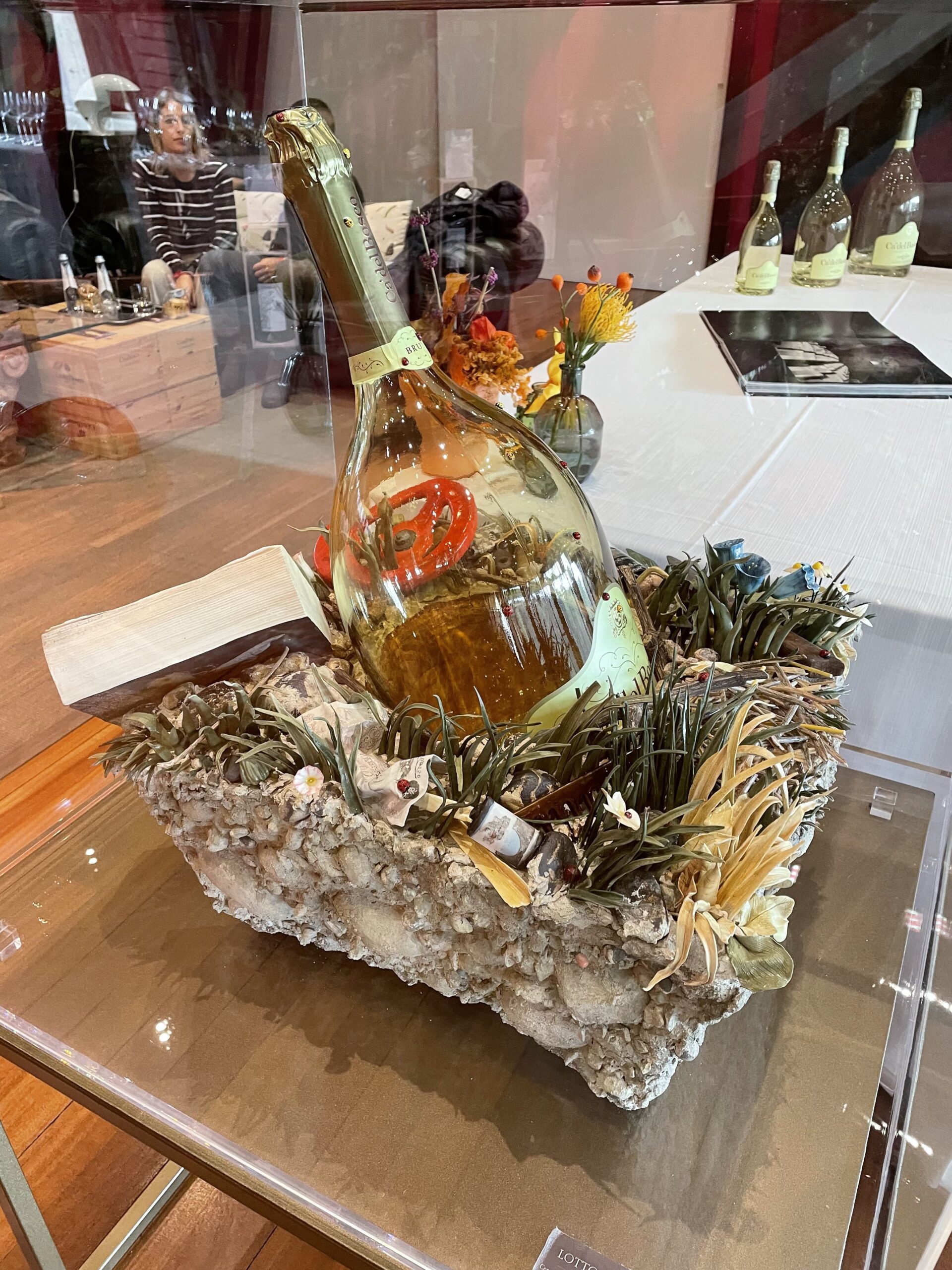Infine, sempre all’interno, nella sala degustazione trova posto “Zolla Natura” di Bertozzi e Casoni, una specie di lente su una porzione di terra con piccoli fiori, libri, erba e sassi. Al centro di questo microcosmo è inserita la bottiglia, che racchiude i